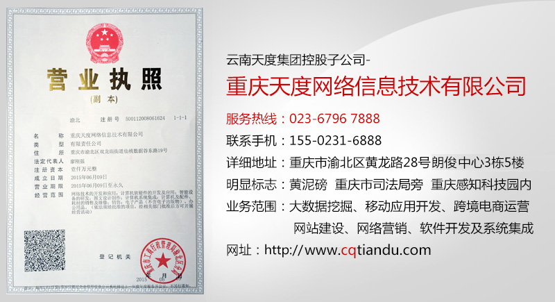 云南天度集團控股子公司-重慶天度網(wǎng)絡信息技術有限公司于2015年6月9日在重慶市渝北區(qū)注冊成立,主要從事大數(shù)據(jù)挖掘、移動應用開發(fā)、跨境電商運營、網(wǎng)站建設、網(wǎng)絡營銷、軟件開發(fā)及系統(tǒng)集成等業(yè)務。公司位于重慶市渝北區(qū)黃龍路28號朗俊中心3棟5樓(整層),服務熱線:023-6796 7888