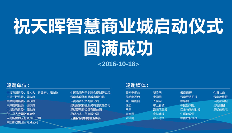 2016年10月18日,由云南天暉投資有限公司、云南天度投資集團(tuán)有限公司和云南天暉城經(jīng)營(yíng)管理有限公司聯(lián)合推出的“天暉智慧商業(yè)城”在大理賓川正式啟動(dòng)。2017年1月19日,天暉城O2O眾創(chuàng)空間落戶賓川,大理州委常委、賓川縣委岳黎松書(shū)記、縣政府楊澤亮縣長(zhǎng)、縣人大張成良主任、縣政協(xié)文慧君主席等相關(guān)領(lǐng)導(dǎo)及縣各部委辦局負(fù)責(zé)人參加了本次活動(dòng)。