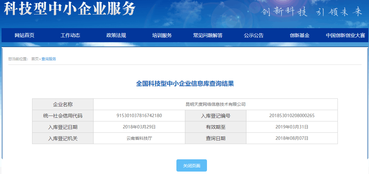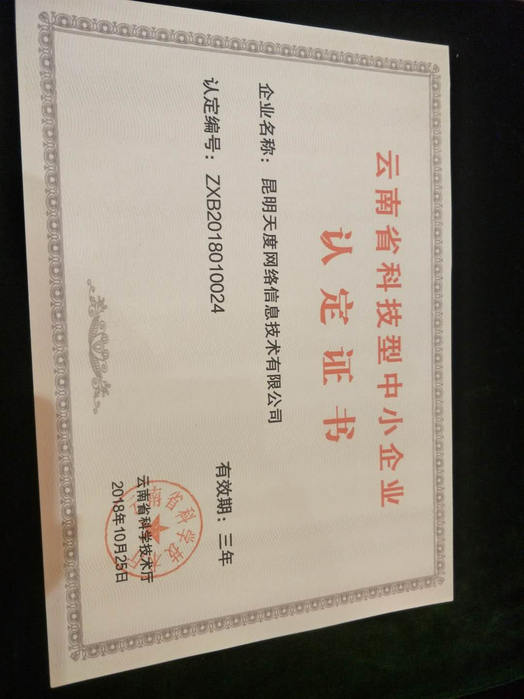經(jīng)科技部門審核,確定天度符合科技型中小企業(yè)要求,3月29日,昆明天度網(wǎng)絡信息技術有限公司成功入庫登記成為2018年“全國科技型中小企業(yè)”!