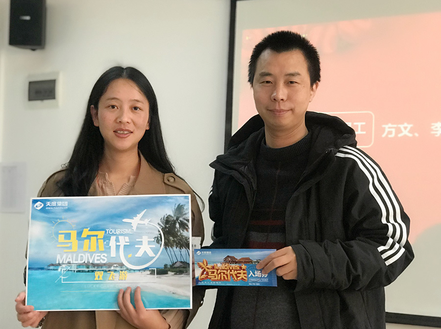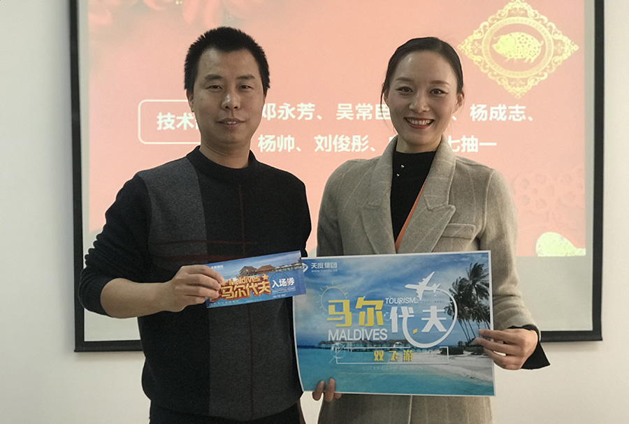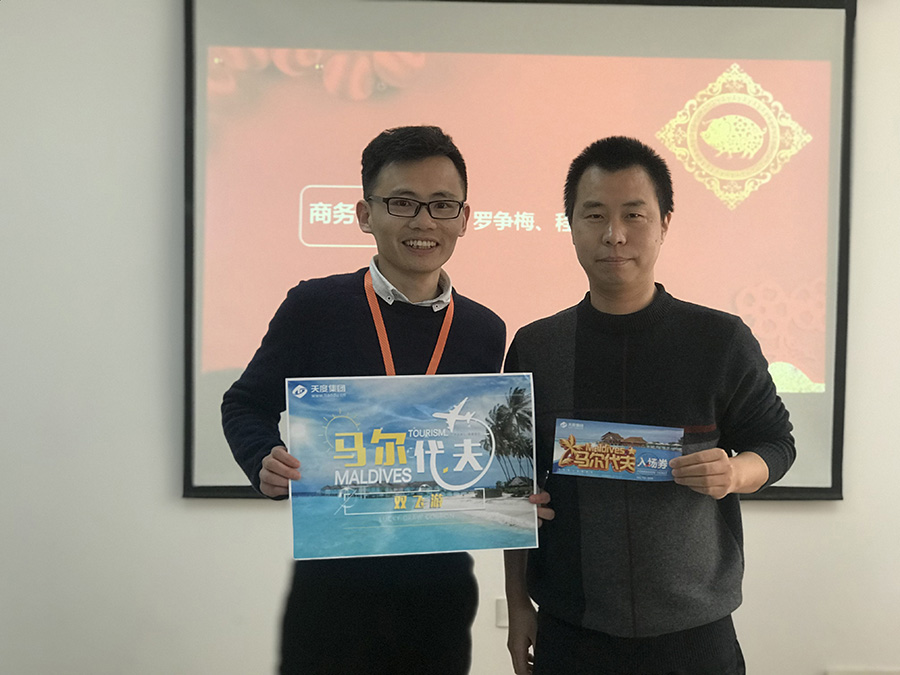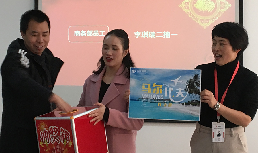 天度網(wǎng)絡公司今年拿出數(shù)十萬現(xiàn)金紅包,由楊總和陸總進行發(fā)放(集團每個公司的獎勵和獎金發(fā)放都是單獨進行,據(jù)悉,集團今年不管是獎金總額、還是獎金單額都超過往年,總額超過7位數(shù))。公司對2018年度各部門優(yōu)秀同事進行了表彰,并發(fā)對各個獎項進行發(fā)放,同時鄭董事長現(xiàn)場抽取了“馬爾代夫帶薪休假旅游”的名額。
