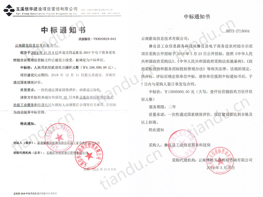 祝賀天度集團(tuán)旗下“云南蔚嵐信息技術(shù)有限公司”中標(biāo)景東縣、景谷縣、孟連縣等三個(gè)縣的電子商務(wù)進(jìn)農(nóng)村綜合示范項(xiàng)目,目前云南蔚嵐信息技術(shù)有限公司已經(jīng)為昭通市彝良縣、大理州巍山縣、普洱市景東縣、普洱市景谷縣、普洱市孟連縣等5個(gè)縣提供了國家電子商務(wù)進(jìn)農(nóng)村綜合示范縣項(xiàng)目的服務(wù)。
