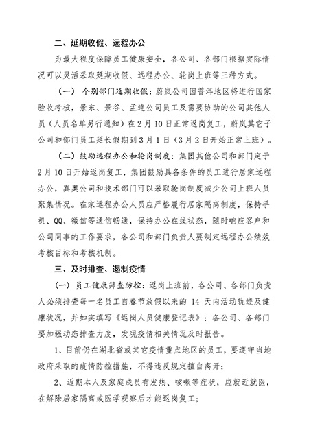 疫情就是命令,防控就是責(zé)任。為貫徹落實(shí)黨中央、國(guó)務(wù)院決策部署,按照省、市、區(qū)黨委和政府有關(guān)工作要求,切實(shí)做好新型冠狀病毒感染的肺炎疫情防控工作,保障員工生命安全和身體健康,集團(tuán)成立新型冠狀病毒感染肺炎疫情防控工作領(lǐng)導(dǎo)小組,并就做好新冠肺炎疫情防控期間員工返崗上班有關(guān)事項(xiàng)作出通知: