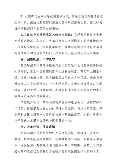 (二)出現(xiàn)突發(fā)或特殊情況的處理措施:在經(jīng)營(yíng)運(yùn)行過(guò)程中若發(fā)現(xiàn)異常情況,各公司、各部門(mén)負(fù)責(zé)人必須即刻向集團(tuán)疫情防控工作領(lǐng)導(dǎo)小組報(bào)告,公司疫情防控工作領(lǐng)導(dǎo)小組將迅速報(bào)告屬地街道辦事處和政府相關(guān)部門(mén),并立即進(jìn)行現(xiàn)場(chǎng)封閉及人員隔離。