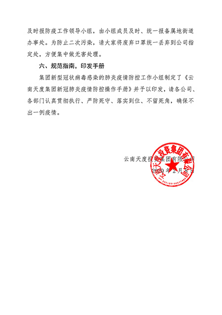 集團(tuán)新型冠狀病毒感染的肺炎疫情防控工作小組制定了《云南天度集團(tuán)新冠肺炎疫情防控操作手冊(cè)》并予以印發(fā),請(qǐng)各公司、各部門(mén)認(rèn)真貫徹執(zhí)行、嚴(yán)防死守、落實(shí)到位、不留死角,確保不出一例疫情。