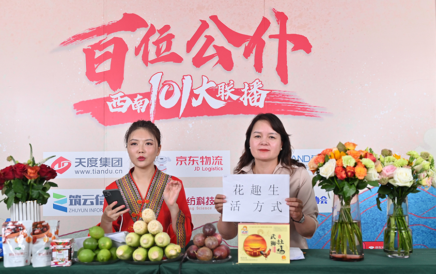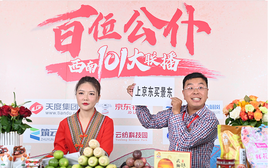6月17日下午,“百位公仆,西南101大聯(lián)播”大型助農(nóng)直播活動(dòng)在云紡科技園直播基地舉行,來(lái)自云南巍山、南澗、水富、個(gè)舊、開(kāi)遠(yuǎn)、彝良、武定、景東、景谷等縣(市)的11位副縣(市)長(zhǎng),與四川知名電視主持人、直播記者郭秀一同走進(jìn)直播間,同框出鏡,為云南各地好貨代言,推動(dòng)農(nóng)產(chǎn)品推廣上行,助力脫貧攻堅(jiān)。近3小時(shí)的直播中,特色的農(nóng)產(chǎn)品、實(shí)惠的價(jià)格,以及豐厚的贈(zèng)品吸引了260多萬(wàn)網(wǎng)友圍觀。