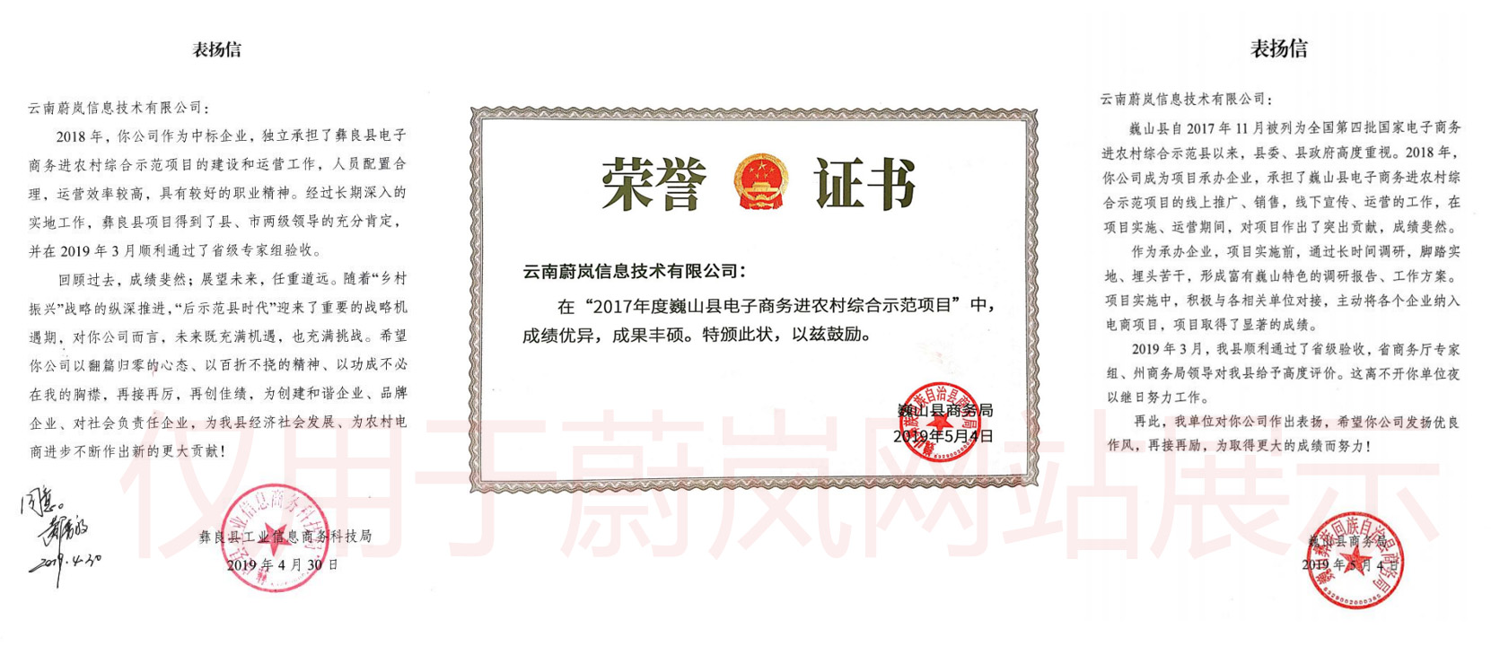 蔚嵐公司已中標(biāo)并承擔(dān)了西雙版納州級(jí)統(tǒng)籌、彝良縣、巍山縣、景東縣、景谷縣、孟連縣、勐臘縣、魯?shù)榭h、水富市、河口縣、峨山縣、盤州市等12個(gè)電子商務(wù)進(jìn)農(nóng)村項(xiàng)目建設(shè)和運(yùn)營(yíng)工作,中標(biāo)臨滄市、文山市、水富市、蒙自市、個(gè)舊市、宣威市、 六盤水市 、麒麟?yún)^(qū)、馬龍區(qū)、陸良縣、永勝縣、 彝良縣、石屏縣、廣南縣、丘北縣等縣域商業(yè)建設(shè)行動(dòng)服務(wù)商,參與和承擔(dān)玉溪市、隆陽(yáng)區(qū)的中國(guó)好糧油行動(dòng)示范縣、示范企業(yè)項(xiàng)目建設(shè)。