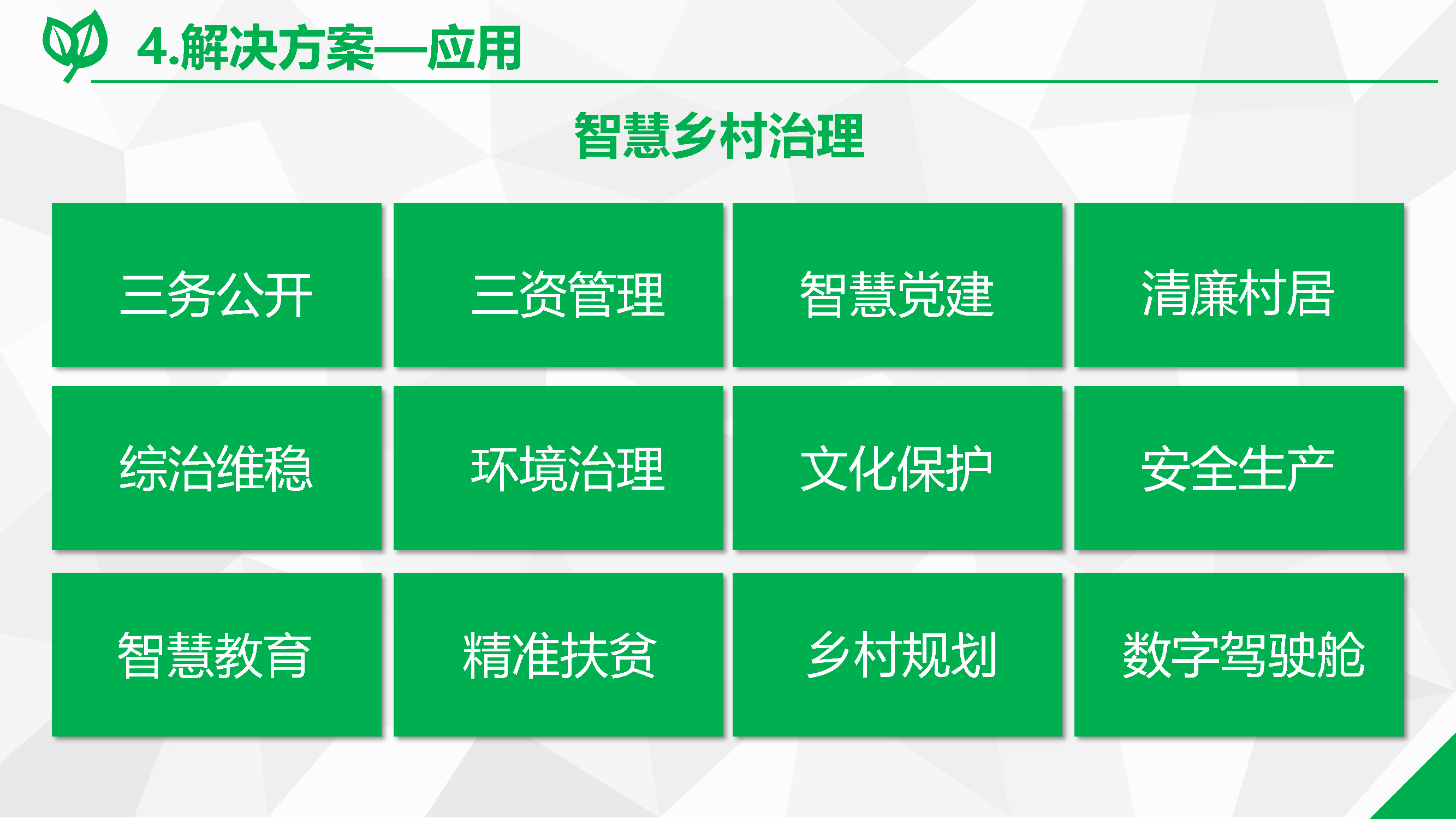根據(jù)鄉(xiāng)村振興戰(zhàn)略的總體部署,鄉(xiāng)村治理工作應(yīng)著重提升智能化、精細(xì)化與專業(yè)化水平。因此,結(jié)合自身的數(shù)字化應(yīng)用開發(fā)能力,聚焦智慧黨建、村鎮(zhèn)環(huán)境保護(hù),以及城鎮(zhèn)綜合行政執(zhí)法工作的數(shù)字化,為縣域建立健全數(shù)字治理新模式提供支撐。