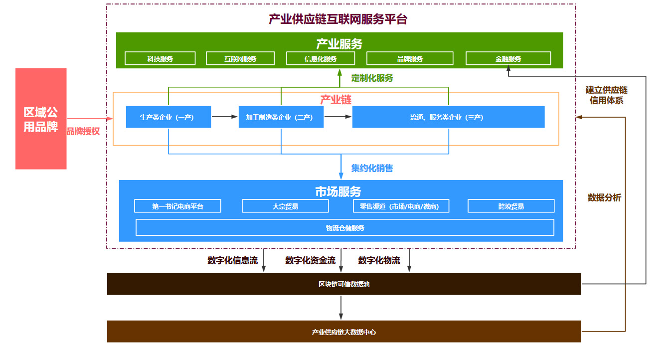數(shù)字化供應鏈服務平臺應立足區(qū)域傳統(tǒng)產(chǎn)業(yè)、優(yōu)勢產(chǎn)業(yè)及重點支柱產(chǎn)業(yè),將電子商務將與發(fā)展需求充分結(jié)合,建立線上線下一體化的服務體系。平臺將區(qū)域品牌化體系建設(shè)為產(chǎn)業(yè)標準入口,服務于供應鏈內(nèi)各企業(yè)主體,貫穿產(chǎn)業(yè)鏈從生產(chǎn)端、加工制造端、流通端全鏈條,以提升供應鏈各主體協(xié)同效率。同時,平臺以數(shù)字化為核心手段及時獲取供應鏈信息流、物流、資金流等數(shù)據(jù),并基于區(qū)塊鏈技術(shù)建立一套產(chǎn)業(yè)可信數(shù)據(jù)池,應用大數(shù)據(jù)分析技術(shù)對供應鏈進行動態(tài)分析,最終實現(xiàn)智慧化供應鏈系統(tǒng),成為基于數(shù)字化供應鏈的集約化、智能化、創(chuàng)新性的開放式產(chǎn)業(yè)生態(tài)平臺,以市場化、數(shù)據(jù)化、智慧化的運營方式促進產(chǎn)業(yè)升級,創(chuàng)造價值與財富。