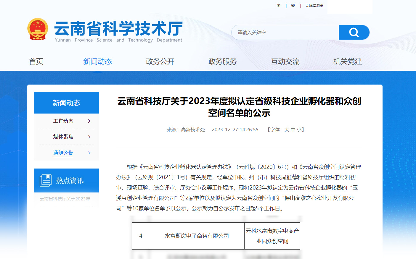 根據(jù)《云南省科技企業(yè)孵化器認(rèn)定管理辦法》(云科規(guī)〔2020〕6號)和《云南省眾創(chuàng)空間認(rèn)定管理辦法》(云科規(guī)〔2021〕1號)有關(guān)規(guī)定,經(jīng)單位申報、州(市)科技局推薦和省科技廳組織的材料初審、現(xiàn)場查驗、綜合評審、廳務(wù)會審議等工作程序,天度集團旗下水富蔚嵐電子商務(wù)有限公司獲“省級眾創(chuàng)空間”認(rèn)定。目前公司已獲得昭通市科技局“昭通市數(shù)字電商科技企業(yè)孵化器”、省工信廳“2022年度中小企業(yè)公共服務(wù)示范平臺”等多項認(rèn)定和榮譽。