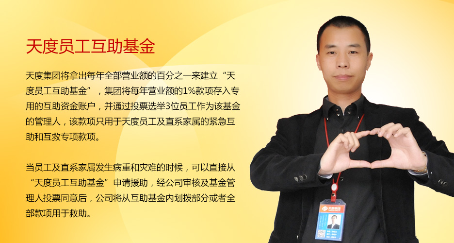 天度集團將拿出每年營業(yè)額的百分來建立“天度員工互助基金”,集團將每年營業(yè)額的近一成款項存入專用的互助資金賬戶,并通過投票選舉3位員工作為該基金的管理人,該款項只用于天度員工及直系家屬的緊急互助和互救專項款項。