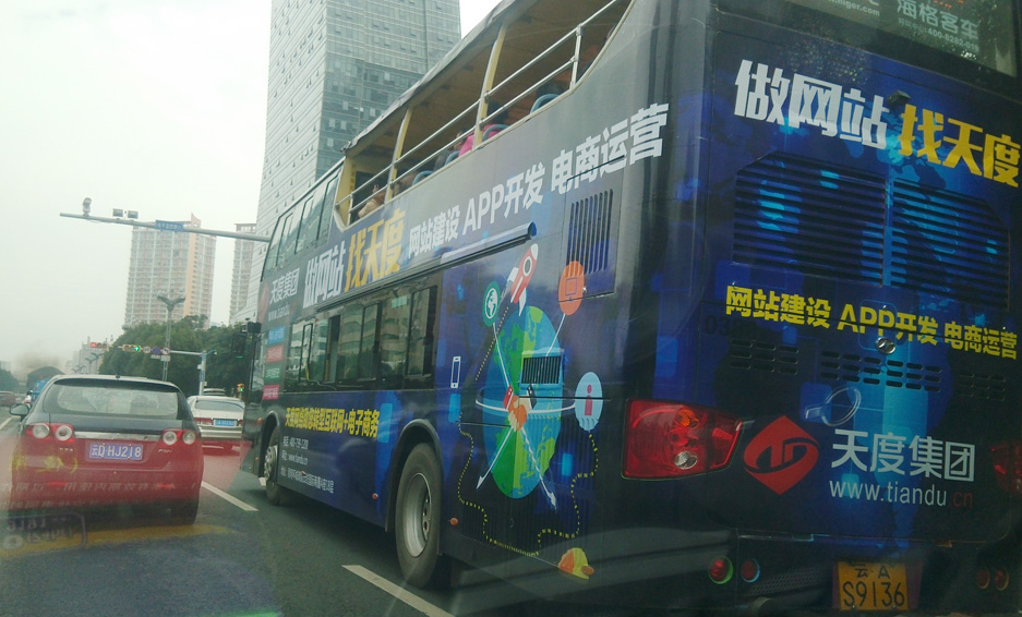 天度集團(tuán)投入巨資進(jìn)行了昆明全城廣告覆蓋,作為云南很具規(guī)模和品牌影響的互聯(lián)網(wǎng)企業(yè),天度為加強(qiáng)品牌影響力,陸續(xù)投入了昆明主要干線雙層大巴公交車車身廣告、車內(nèi)靠背廣告、公交車電視廣告、機(jī)場大巴雜志封面廣告、市區(qū)基地各大路牌燈箱廣告、電梯廣告、市基地戶外LED大屏廣告、新高速收費(fèi)站廣告、影院LED廣告、商圈燈箱廣告、樓宇燈箱廣告、KTV燈箱廣告、平面報(bào)刊廣告、網(wǎng)絡(luò)廣告等。相信本輪廣告的投放,將加大云南企業(yè)家對互聯(lián)網(wǎng)轉(zhuǎn)型的認(rèn)識,并促進(jìn)天度公司的快速發(fā)展。